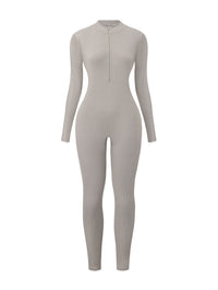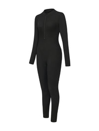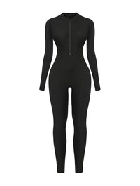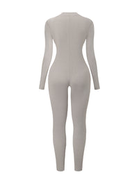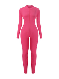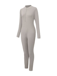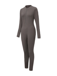 Crafted from a stretchy ribbed fabric, this jumpsuit hugs your curves while still offering breathability and comfort. The front zip detail lets you adjust the neckline to your style, while the long sleeves and full-length legs make it a versatile piece you can wear year-round. Thumbhole sleeves add a sleek finish and keep everything in place, no matter where the day takes you.