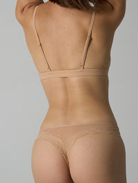 De bralette heeft fijne geschulpte kant langs de halslijn voor een romantische touch, draadloze ondersteuning voor natuurlijke lift, en verstelbare bandjes voor jouw beste pasvorm. De bijpassende string weerspiegelt dezelfde kantachtige details en biedt minimale bedekking met maximale gladheid onder elke outfit. Gemaakt van ultra-rekbare, tweede-huid stof, beweegt deze set met je mee en voelt nauwelijks aanwezig—waardoor het jouw nieuwe favoriet wordt voor dagelijks gebruik, date nights en alles daartussenin.